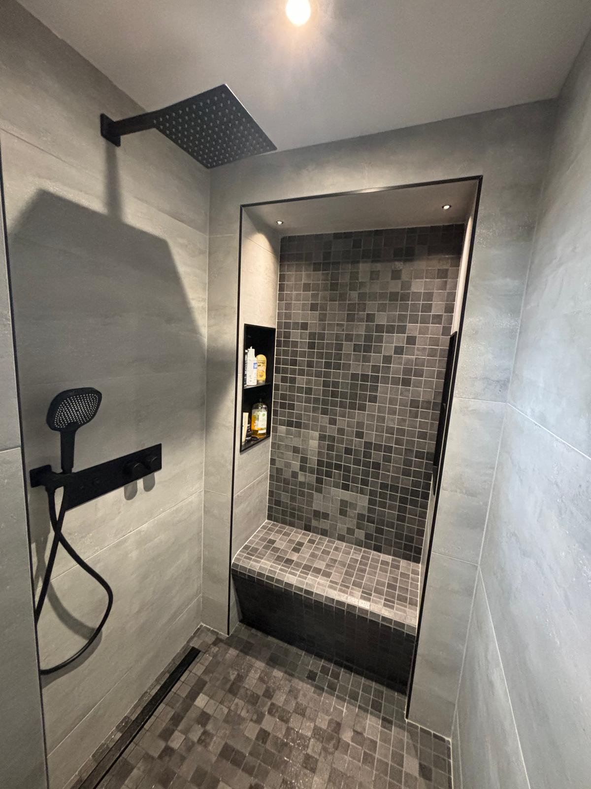 Réalisation complète d’une douche à l’italienne moderne, avec carrelage gris anthracite et mosaïque assortie. Aménagement sur mesure avec banc intégré, niches murales encastrées et robinetterie noire mate pour un style chic et minimaliste. Travail précis d’étanchéité, finitions soignées et alignement parfait des carreaux pour une salle de bain élégante et durable.