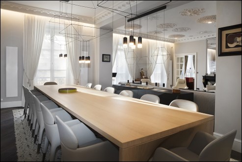 Réalisation d’une salle à manger design et lumineuse, mêlant élégance et modernité. Travaux de rénovation intérieure complète : peinture, moulures, éclairage suspendu sur mesure et pose d’un grand mobilier en bois clair. Ambiance chic et épurée, sublimée par la lumière naturelle et des finitions haut de gamme.