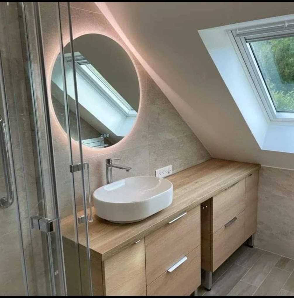 Cette superbe salle de bain sous combles mise sur la lumière naturelle et la chaleur du bois. Le meuble en bois clair sur mesure s’harmonise avec un plan vasque moderne en céramique blanche et un grand miroir rond rétroéclairé LED, créant une atmosphère douce et élégante. Le carrelage mural effet pierre beige et la douche vitrée complètent cet espace optimisé et design, parfait pour une rénovation haut de gamme.