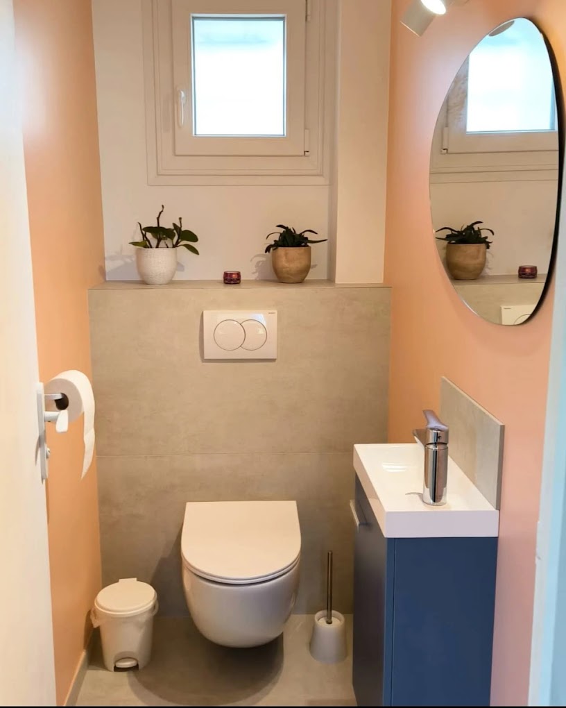 Ces toilettes contemporaines associent élégance et fonctionnalité. Le WC suspendu offre un style épuré et facilite l’entretien, tandis que le lave-mains compact s’intègre parfaitement dans l’espace restreint. Les murs couleur terracotta apportent chaleur et modernité, en contraste avec le carrelage mural effet béton clair. L’ensemble est sublimé par un miroir rond et des luminaires discrets, créant une ambiance douce et accueillante.