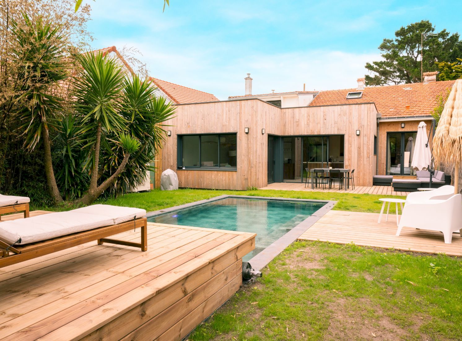 Cette photo illustre la rénovation complète d’une maison contemporaine, entièrement repensée avec un bardage bois moderne, de grandes ouvertures et un aménagement extérieur haut de gamme. L’intégration d’une piscine, d’une terrasse en bois et d’un espace détente transforme le jardin en véritable lieu de vie. Le projet met en avant une architecture chaleureuse, des matériaux naturels et une harmonie entre intérieur et extérieur, permettant d’offrir un confort optimal et une esthétique moderne. Une rénovation idéale pour valoriser une maison tout en créant un espace extérieur élégant et fonctionnel.