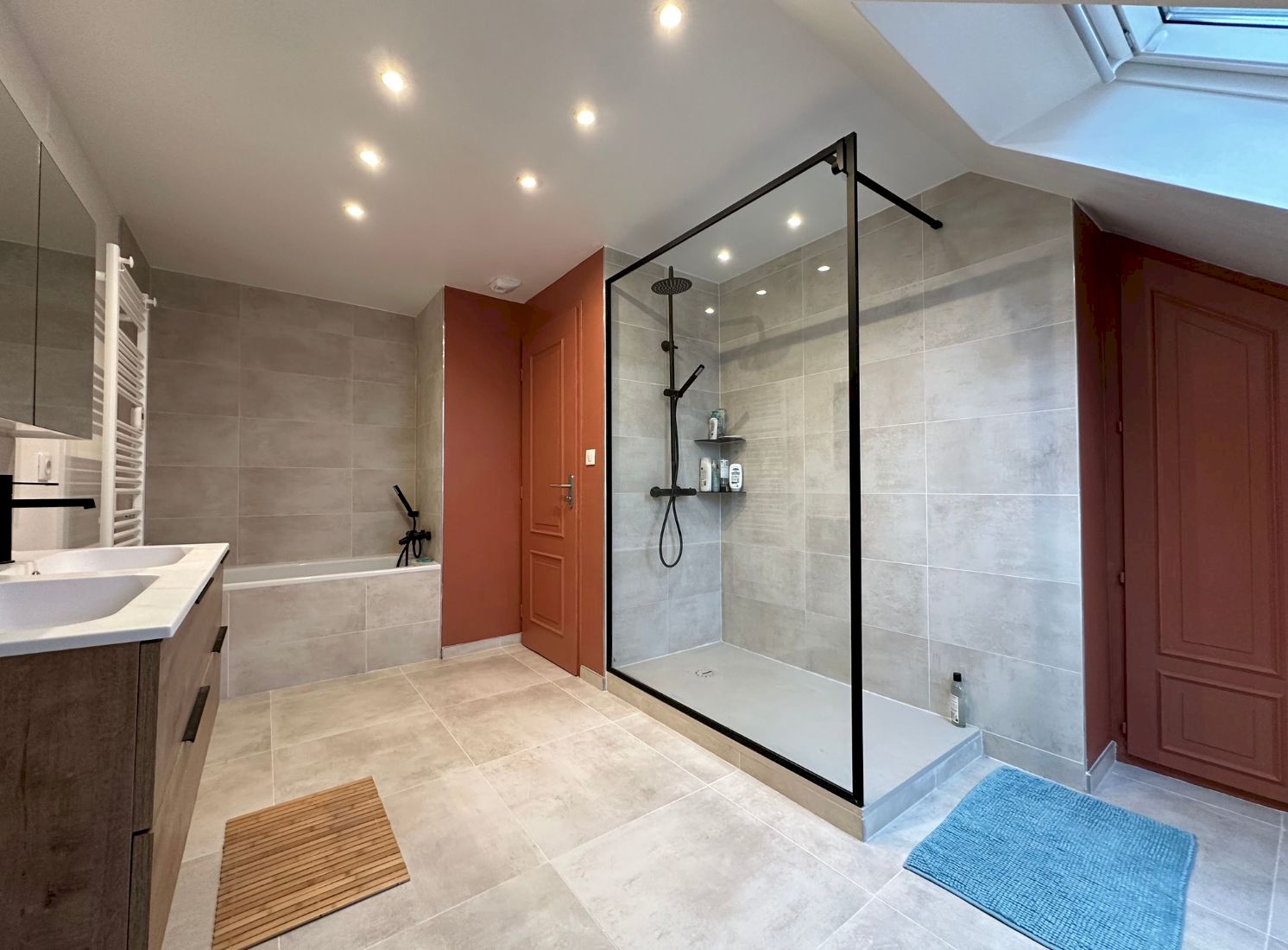Cette photo présente la rénovation complète d’une salle de bains moderne alliant style et fonctionnalité. L’espace a été repensé avec un grand carrelage effet pierre, une douche à l’italienne élégante aux finitions noires mates, ainsi qu’une baignoire intégrée pour un confort optimal. Les touches de couleur terracotta apportent chaleur et caractère à la pièce, tandis que l’éclairage encastré offre une ambiance à la fois douce et contemporaine. Une transformation qui valorise l’espace, améliore la luminosité et crée une salle de bains raffinée et pratique au quotidien.