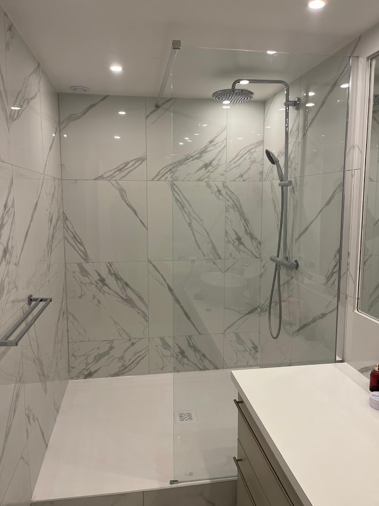 Cette douche à l’italienne élégante met en valeur un carrelage mural effet marbre blanc veiné de gris, pour un rendu à la fois lumineux et luxueux. L’espace est délimité par une paroi en verre transparent et équipé d’une colonne de douche chromée avec pomme haute pluie, offrant confort et modernité. Associée à un receveur extra-plat et un éclairage LED encastré, cette salle de bain reflète un design contemporain et épuré, idéal pour une rénovation haut de gamme