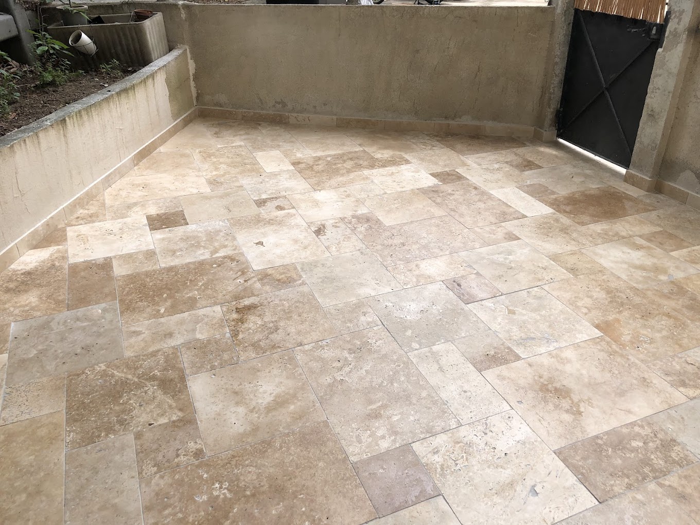 Cette terrasse extérieure a été réalisée en travertin beige nuancé, une pierre naturelle reconnue pour son charme authentique et sa durabilité. Le calepinage en opus romain apporte du rythme et une touche méditerranéenne à l’espace, tandis que les teintes chaudes du travertin s’harmonisent parfaitement avec les murs clairs. Résistante aux intempéries et antidérapante, cette terrasse en pierre naturelle allie esthétique et longévité, idéale pour les aménagements extérieurs contemporains ou traditionnels.