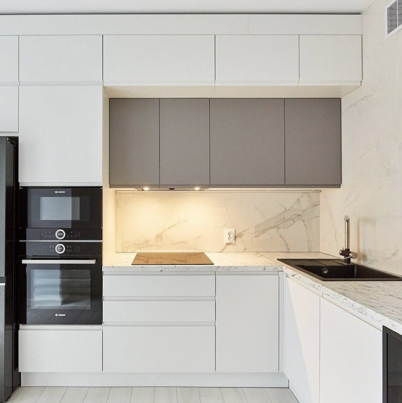 Conception et installation d’une cuisine contemporaine sur mesure au design épuré. Cette réalisation associe meubles laqués blancs et placards gris mat, avec un plan de travail effet marbre pour un rendu élégant et lumineux. L’agencement intègre des appareils encastrés haut de gamme Bosch, une plaque à induction et un évier moderne à encastrement. Idéale pour les amateurs de cuisines modernes, fonctionnelles et esthétiques.