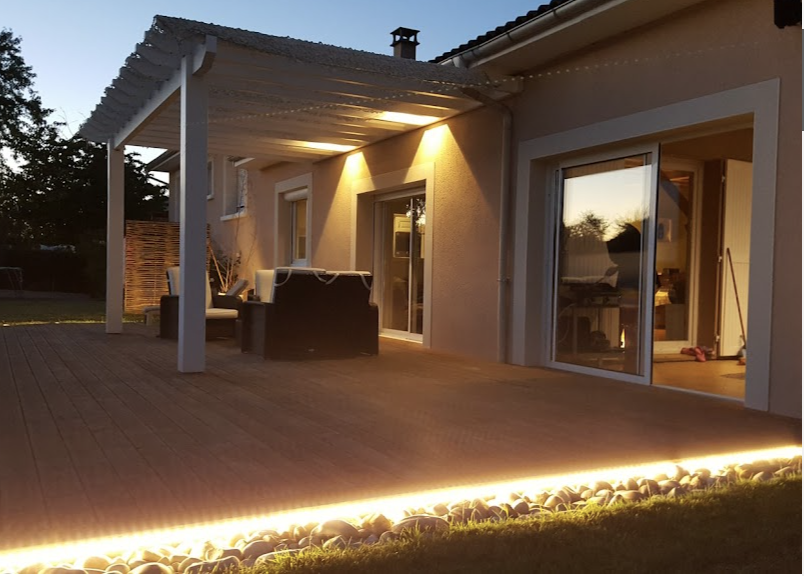 Réalisation d’une terrasse extérieure en bois accompagnée d’une pergola sur mesure avec éclairage LED encastré. Ce projet met en valeur l’espace de vie extérieur tout en offrant un confort et une ambiance chaleureuse de nuit. La structure bois et les spots intégrés assurent durabilité et esthétisme. Idéal pour profiter d’un espace détente élégant et fonctionnel au fil des saisons.