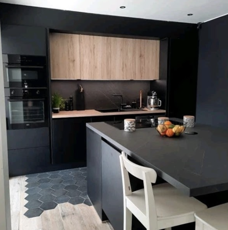 Installation d’une cuisine moderne noire et bois avec îlot central fonctionnel. Ce projet associe élégance et ergonomie grâce à des meubles mat texturés, un plan de travail effet pierre, et des rangements optimisés. L’alliance du noir et du chêne clair apporte chaleur et contraste à l’espace. Une cuisine à la fois design, durable et conviviale, idéale pour les intérieurs contemporains.