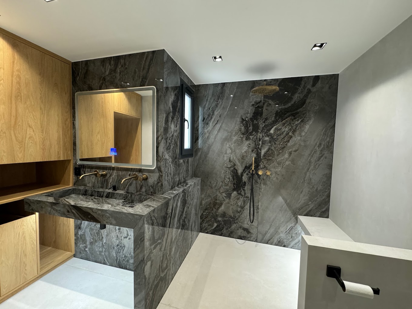 Rénovation complète d’une salle de bain design alliant élégance et fonctionnalité. Ce projet met en avant un espace contemporain avec des revêtements en marbre gris texturé, un meuble sur mesure en bois clair et des finitions en laiton brossé. Douche à l’italienne intégrée, double vasque sculptée dans la pierre et éclairage encastré pour une atmosphère raffinée et minimaliste. Un équilibre parfait entre matériaux naturels et lignes modernes, conçu pour offrir confort, durabilité et esthétisme haut de gamme.