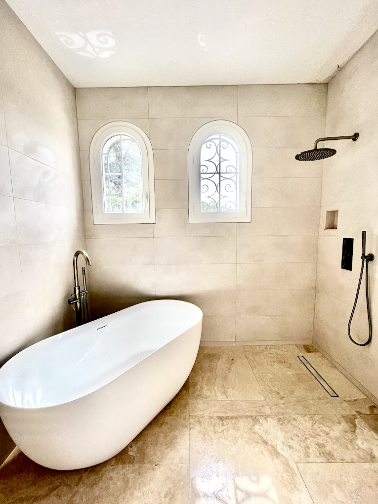 Aménagement d’une salle de bain élégante mariant tons naturels et lignes épurées. L’espace se distingue par une baignoire îlot design, une douche à l’italienne moderne et des revêtements en pierre beige aux finitions satinées. Les deux fenêtres cintrées apportent une lumière douce et naturelle, soulignant le raffinement du carrelage et la pureté des matériaux. Un projet pensé pour offrir détente, confort et esthétisme dans un style méditerranéen contemporain.