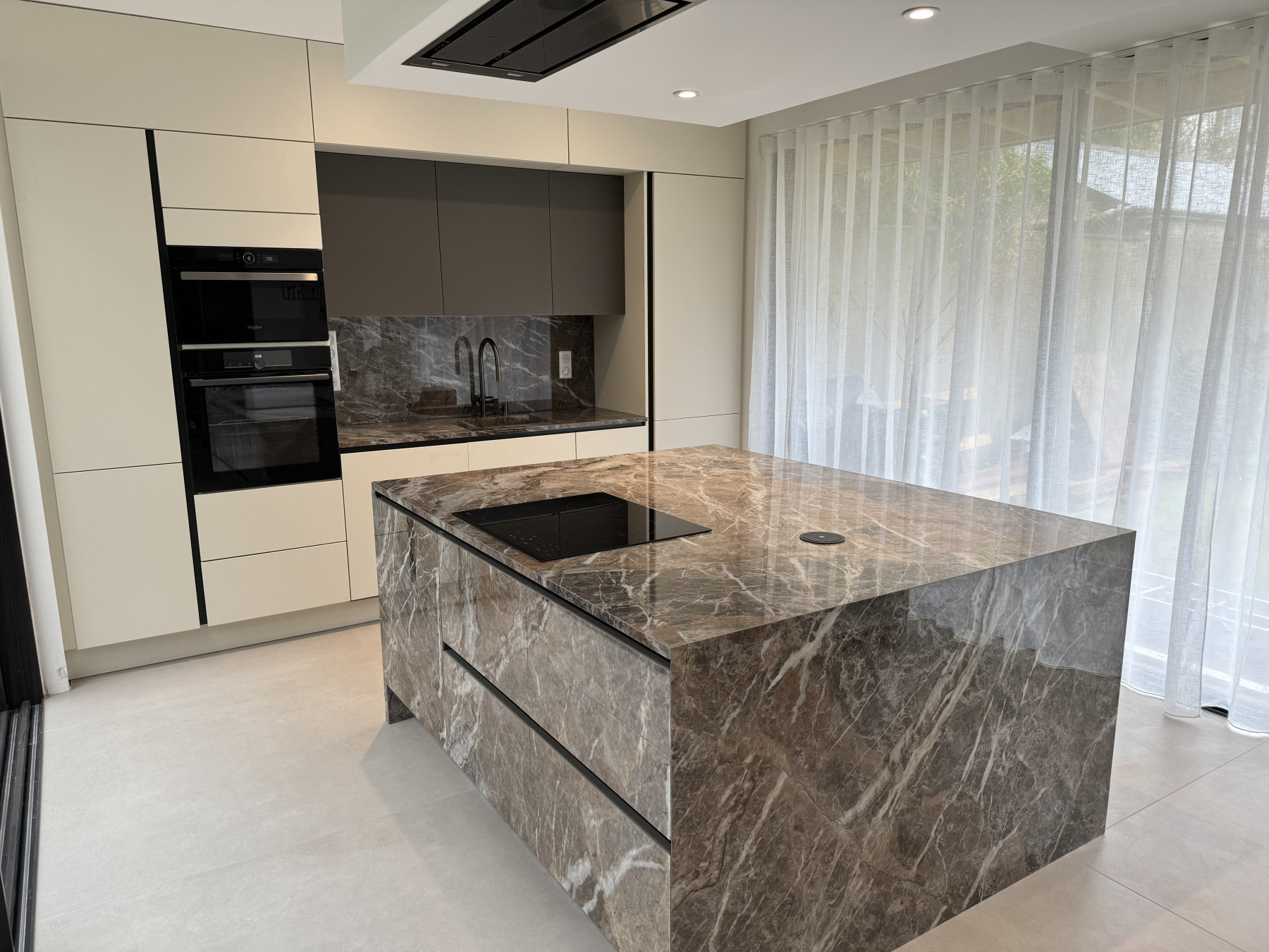 Réalisation d’une cuisine haut de gamme mêlant élégance minérale et modernité. Le plan de travail et l’îlot central sont entièrement réalisés en marbre poli, offrant un contraste saisissant avec les façades mates beige et anthracite. L’espace, baigné de lumière naturelle grâce à de larges baies vitrées, met en valeur la précision des finitions et l’intégration parfaite des appareils encastrés. Une conception sur mesure pensée pour allier esthétique, ergonomie et durabilité.