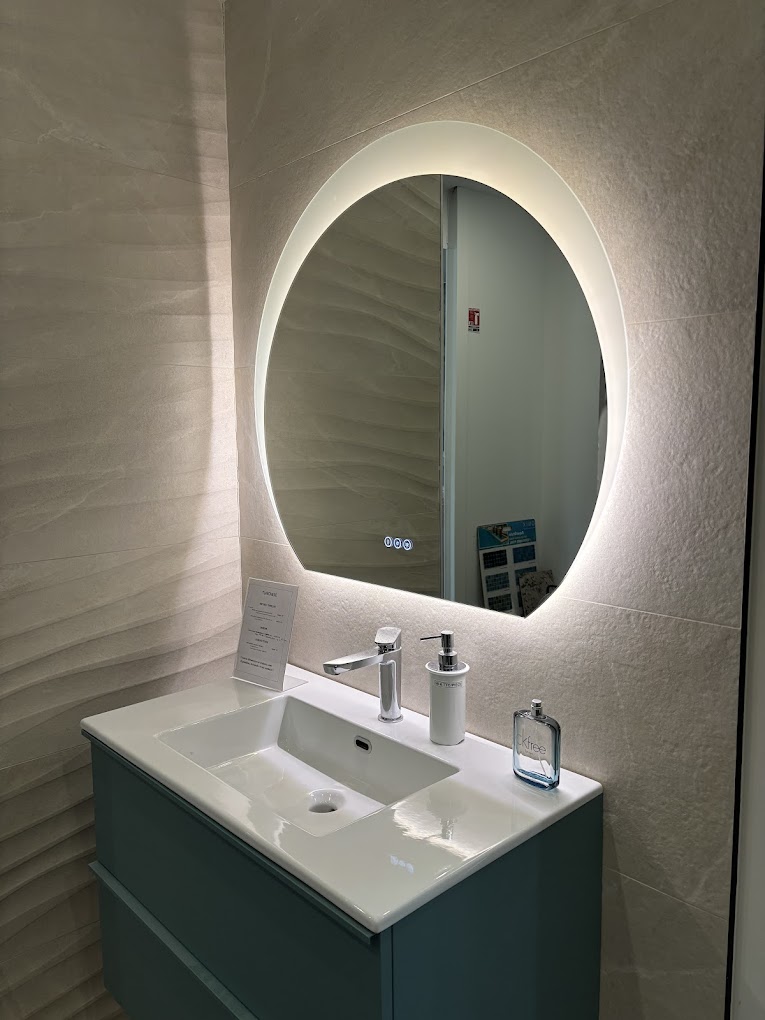 Cette salle de bain au style contemporain met en valeur un meuble suspendu bleu canard surmonté d’un plan vasque blanc brillant, accompagné d’un grand miroir rond rétroéclairé LED. Le carrelage mural texturé effet pierre beige apporte relief et élégance à l’ensemble. Idéale pour une rénovation haut de gamme, cette composition allie modernité, luminosité et confort.