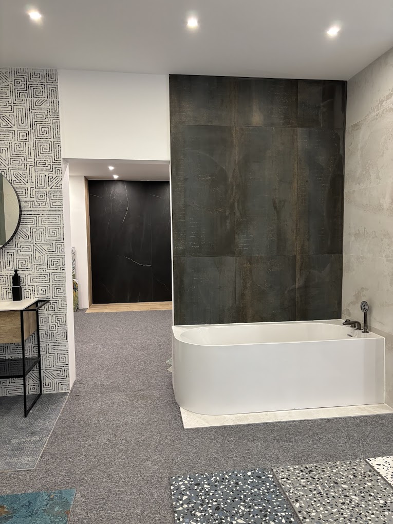 Cette salle de bain moderne combine textures et contrastes : une baignoire îlot blanche adossée à un mur carrelé effet métal oxydé, un revêtement graphique noir et blanc, et des carrelages au sol terrazzo bleu et gris. L’éclairage LED intégré met en valeur les matériaux et crée une atmosphère élégante et contemporaine, idéale pour une rénovation haut de gamme. 💡 Mots-clés SEO suggérés : carrelage effet métal, baignoire îlot moderne, carrelage terrazzo, salle de bain design Essonne, rénovation salle de bain haut de gamme