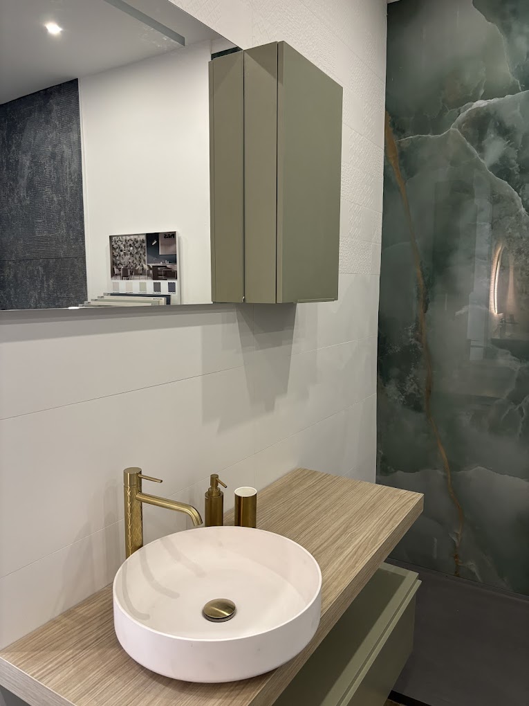 Cette salle de bain raffinée associe matériaux nobles et teintes naturelles. Sur un plan en bois clair, une vasque ronde en céramique blanche s’accorde parfaitement avec une robinetterie dorée brossée, apportant une touche de luxe subtile. En fond, un mur carrelé effet marbre vert veiné crée un contraste sophistiqué avec les surfaces blanches et les meubles suspendus kaki. Un design moderne, idéal pour un projet de rénovation ou de création de salle de bain sur mesure.
