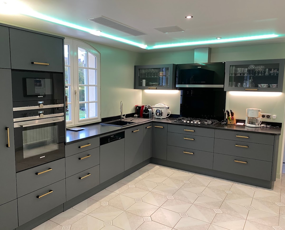 Conception d’une cuisine contemporaine sur mesure, pensée pour allier fonctionnalité et design. Les façades gris anthracite mates sont rehaussées par des poignées dorées, apportant une touche d’élégance et de contraste. Le plan de travail en quartz sombre, les appareils encastrés Siemens et l’éclairage LED intégré sous les meubles et au plafond créent une ambiance raffinée et ergonomique. Un agencement en L optimisé pour la circulation, la lumière naturelle et le confort d’utilisation au quotidien.