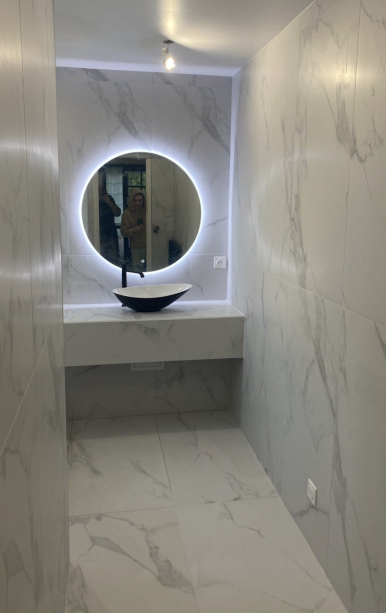 Réalisation d’une salle de bain contemporaine avec un revêtement mural et sol en grès cérame effet marbre. Le miroir rétroéclairé et la vasque design apportent une touche d’élégance et de modernité. Cet aménagement associe esthétique haut de gamme et fonctionnalité, pour un résultat durable et facile d’entretien. Un projet sur mesure mettant en valeur le savoir-faire en rénovation intérieure, idéal pour les logements modernes, hôtels ou espaces bien-être.